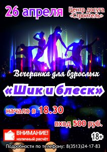 26 апреля Центр досуга вновь приглашает на зажигательную вечеринку для взрослых. Конкурсы, игры, яркая ведущая и танцевальная программа ждут Вас и ваших друзей!