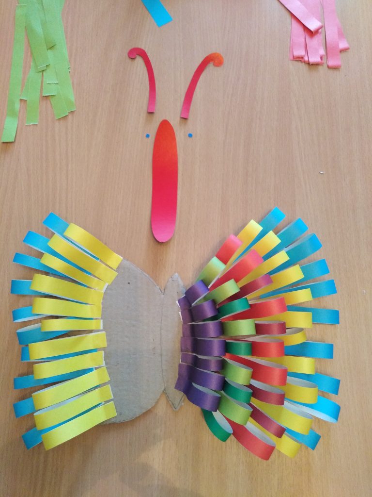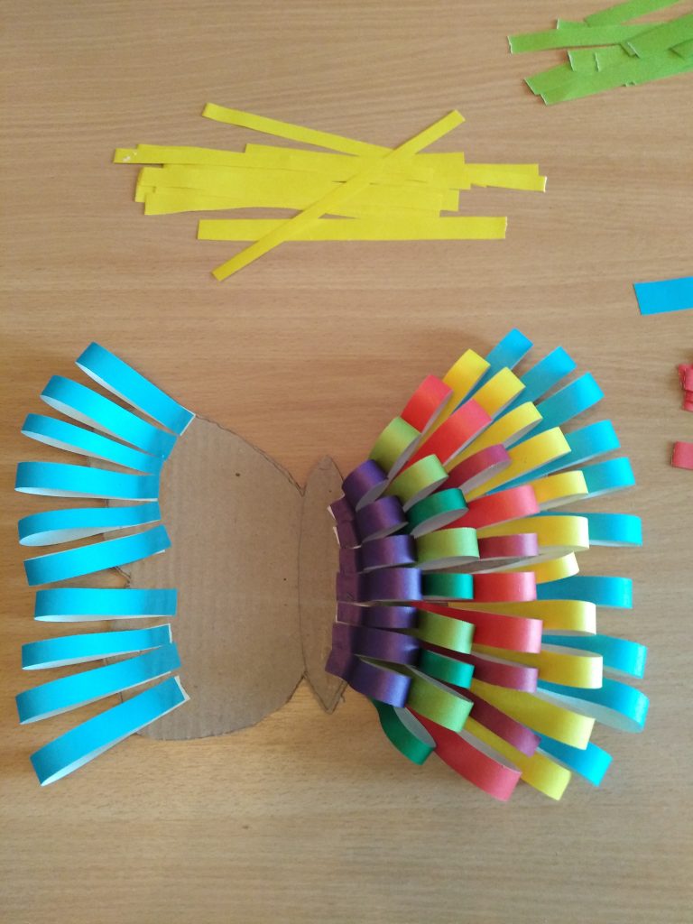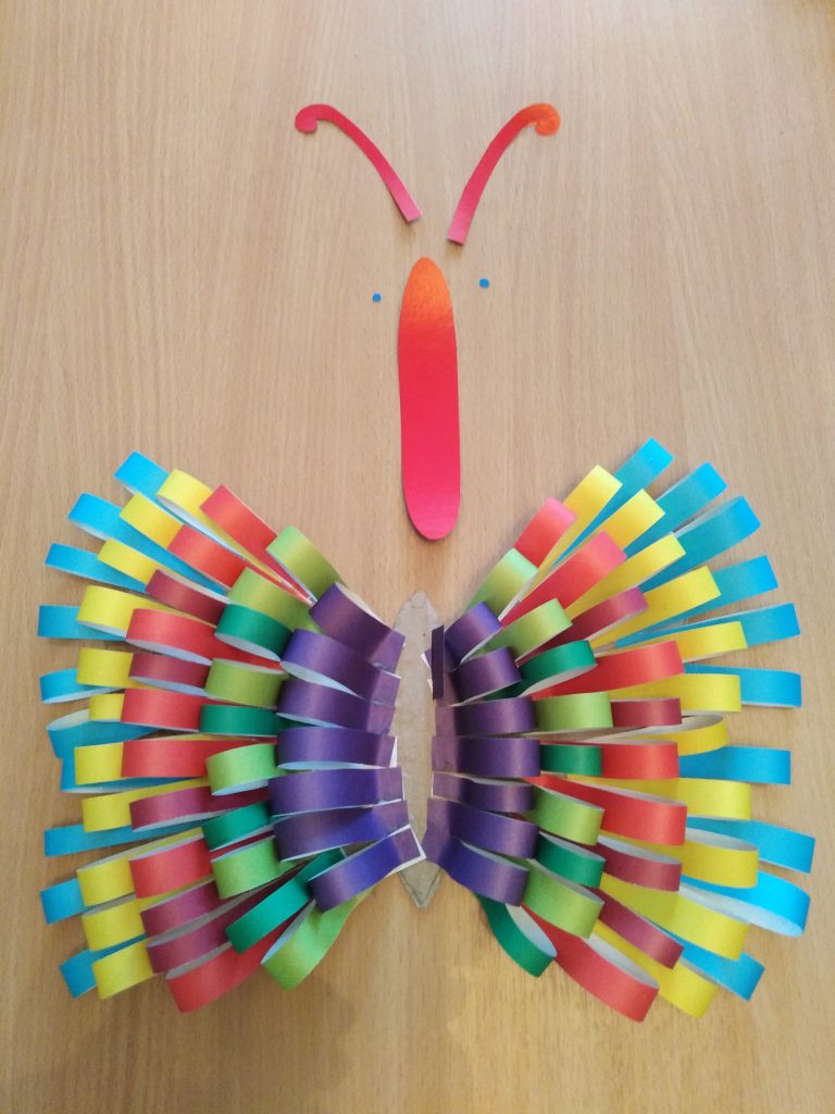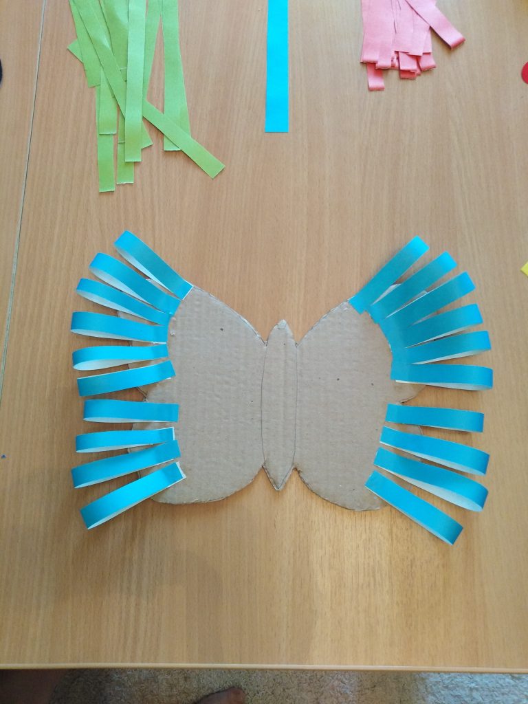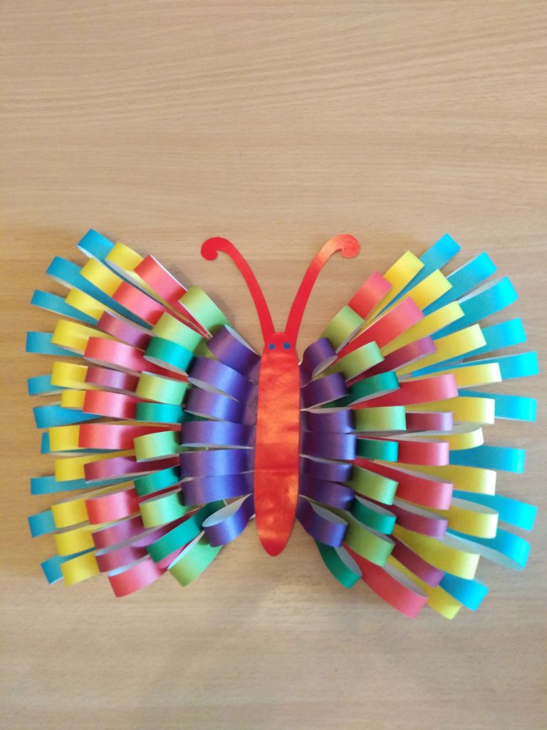 Наклеиваем полоски из цвет. бумаги (одного цвета) на края крыльев. Делаем крылья объёмными.