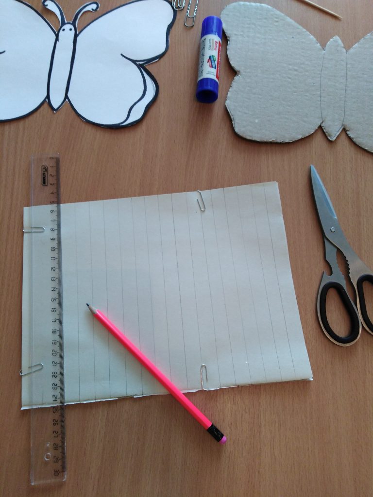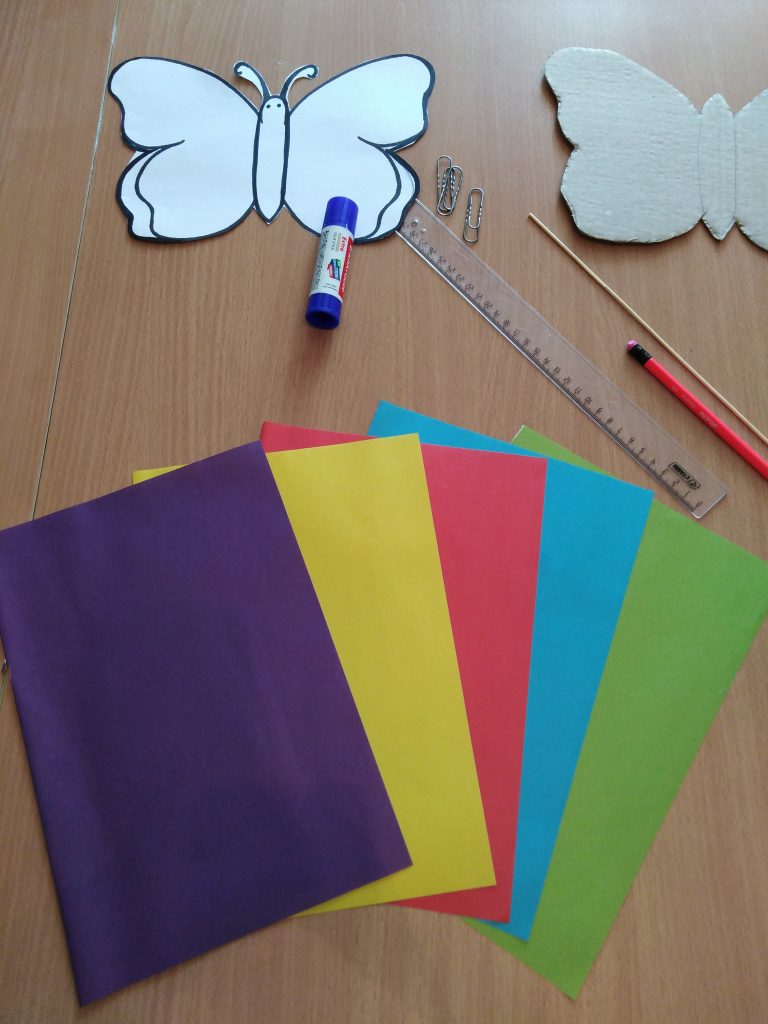 Для изготовление бабочки нам нужно (картон, цвет. бумага, карандаш, линейка, ножницы, клей карандаш, деревянная шпажка скрепки.)