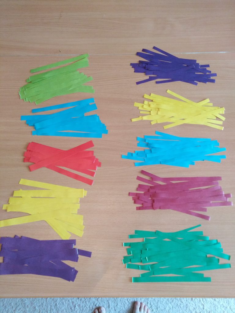 Нарезаем полоски из цветной бумаги шириной 1 см. ( разного цвета.)