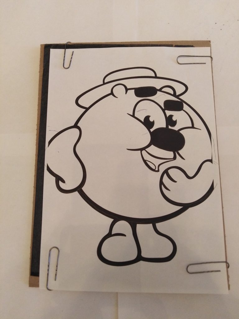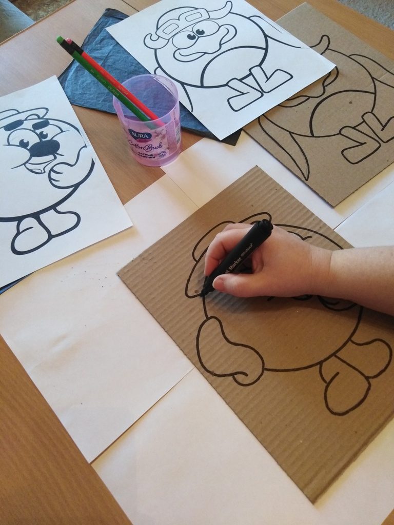 Обводим карандашом контур на шаблоне хорошо надавливая. Затем убираем шаблон и копирку, получившийся оттиск на картоне обводим чёрным маркером.