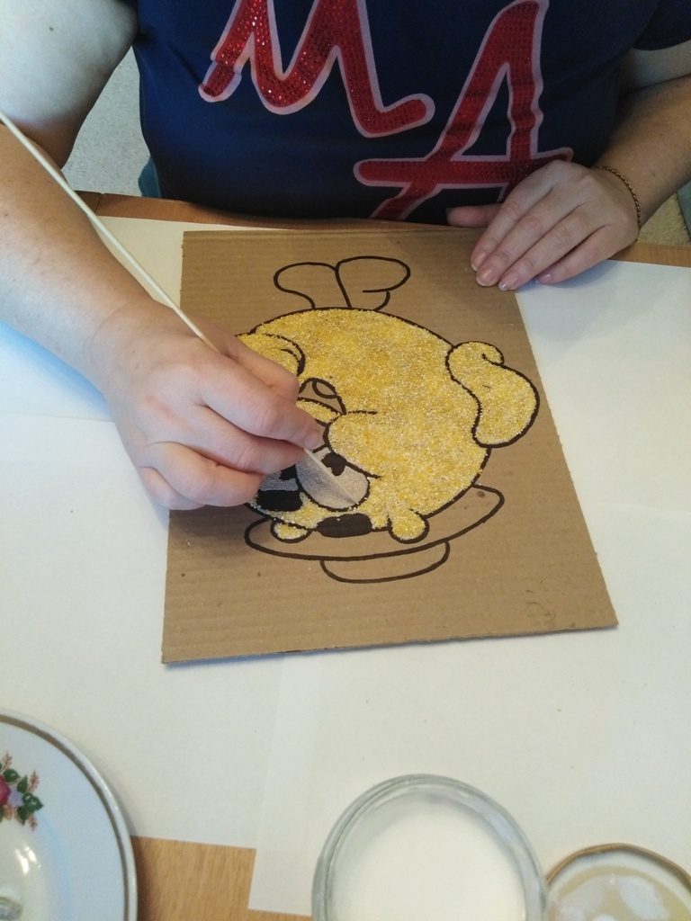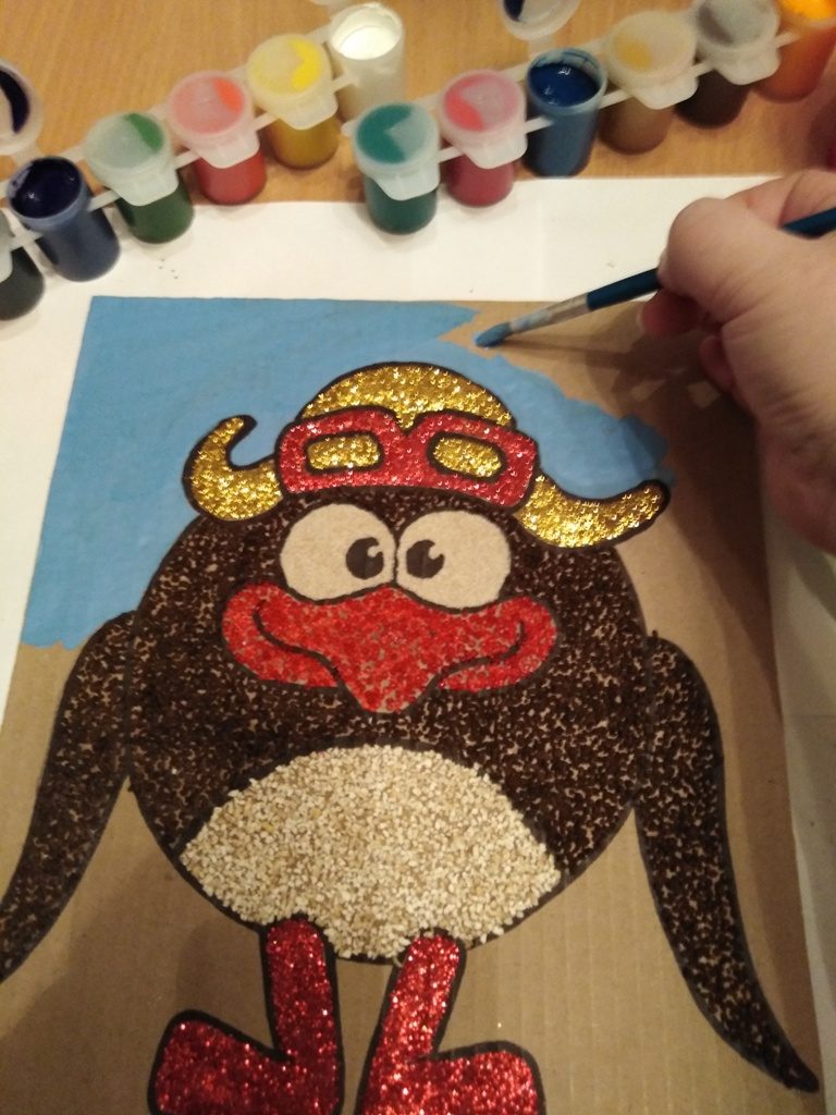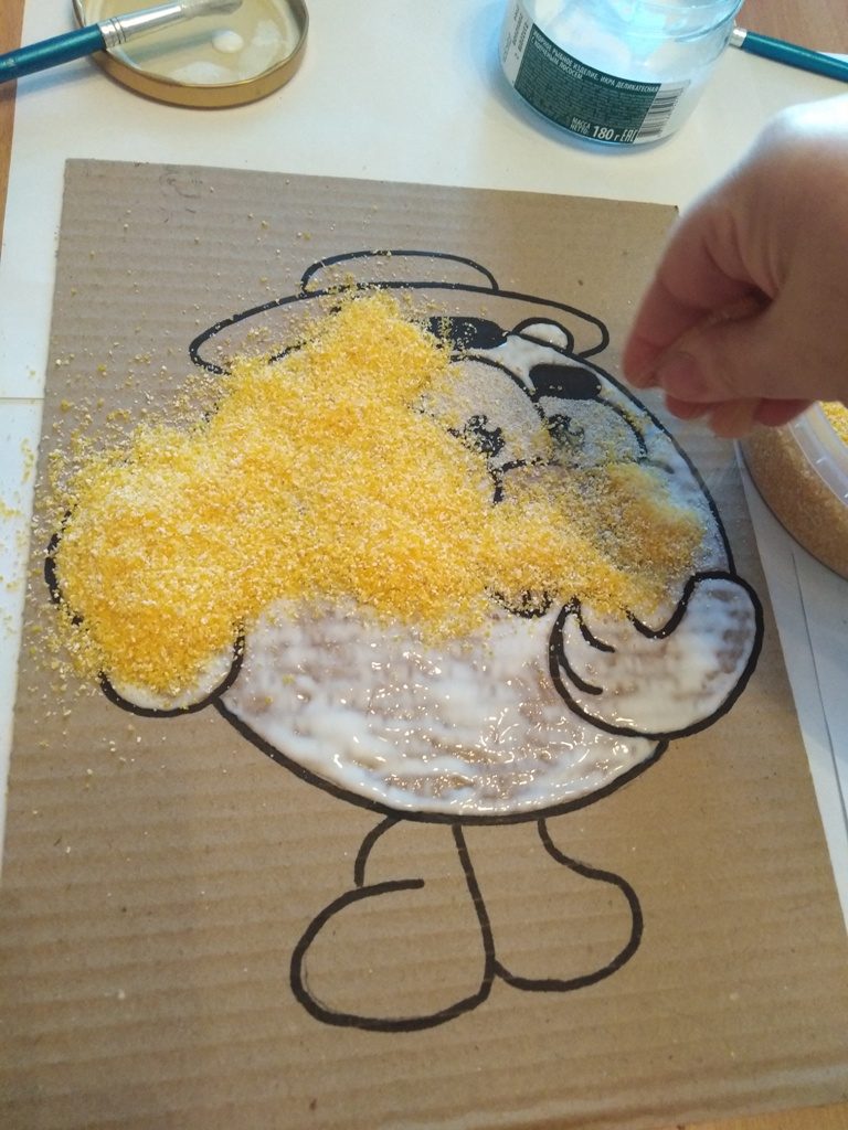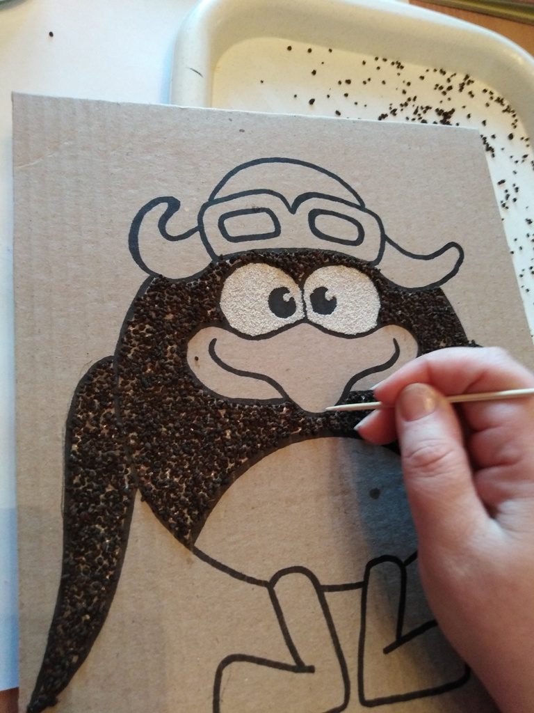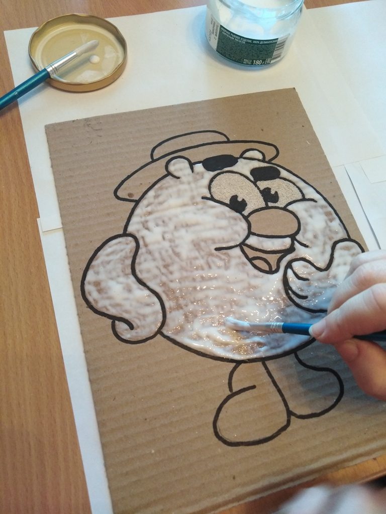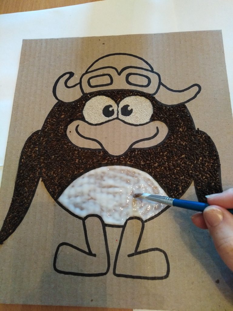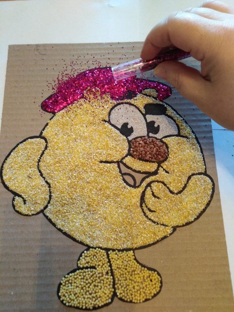 Следующий этап работа с клеем и крупами. Аккуратно наносим клей толстым слоем на нужную часть картинки и засыпаем крупой или гр. чаем или блёстками или бисером. /как на фото/