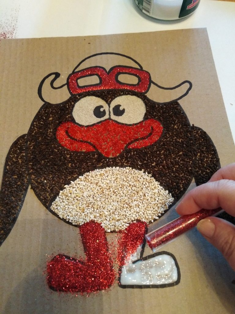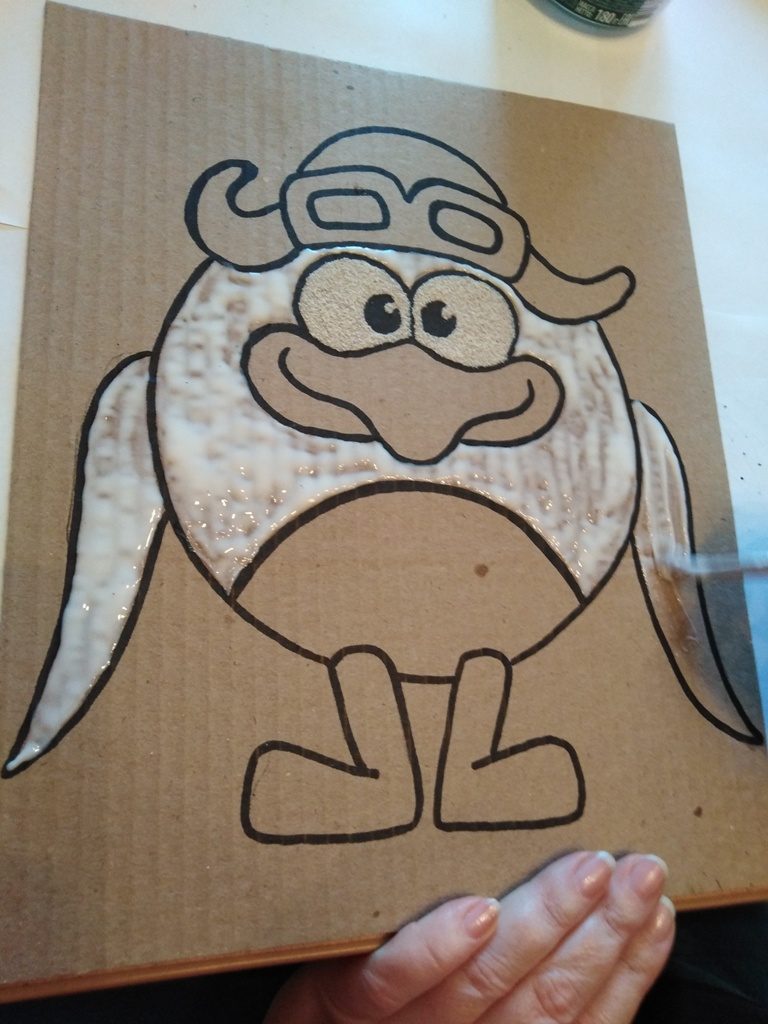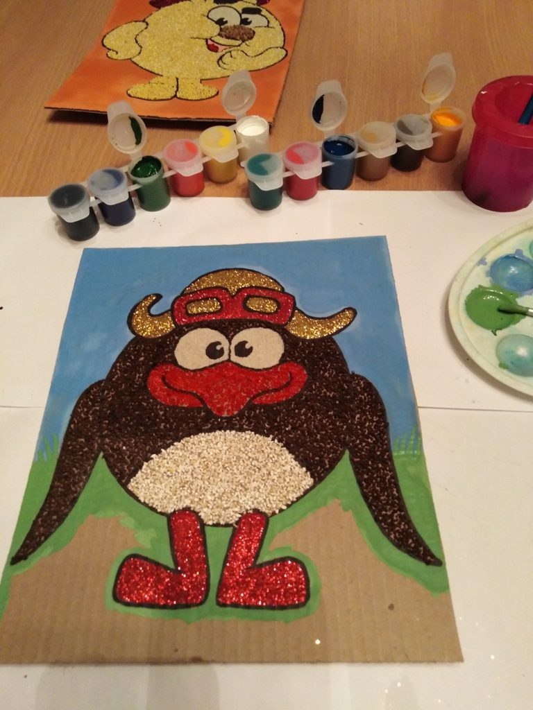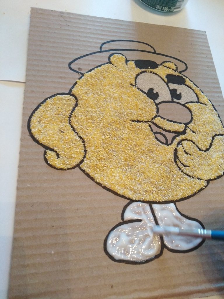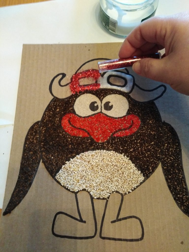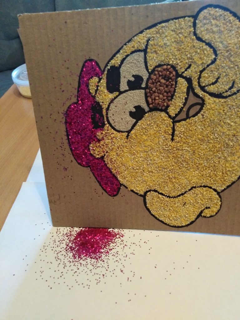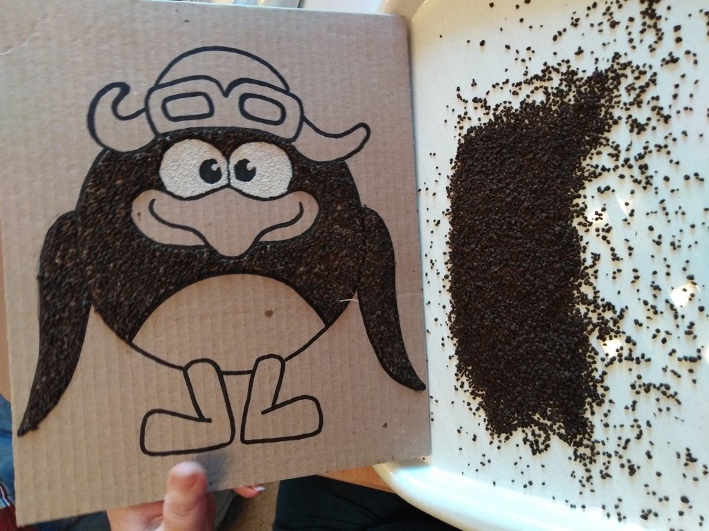 Следующий этап работа с клеем и крупами. Аккуратно наносим клей толстым слоем на нужную часть картинки и засыпаем крупой или гр. чаем или блёстками или бисером. /как на фото/