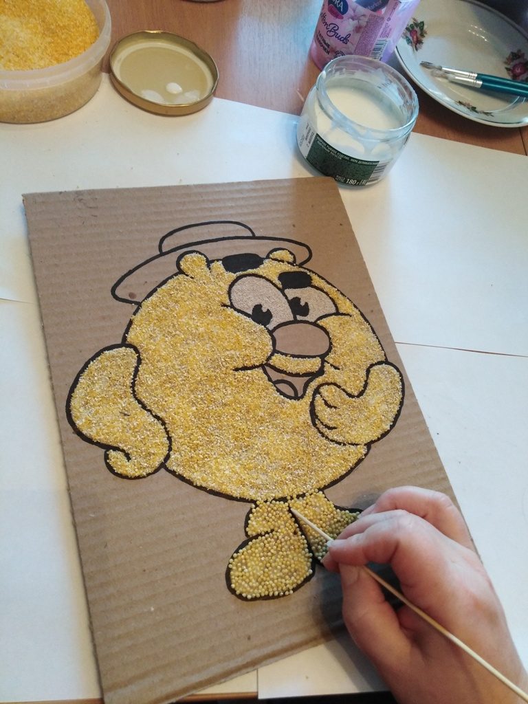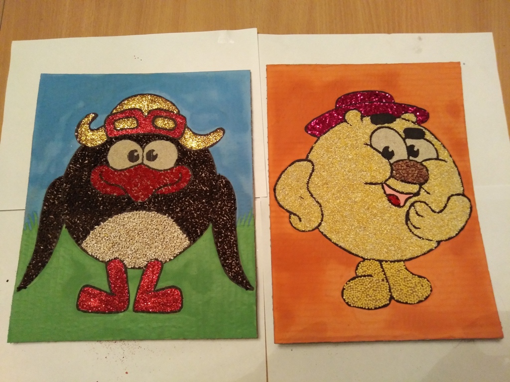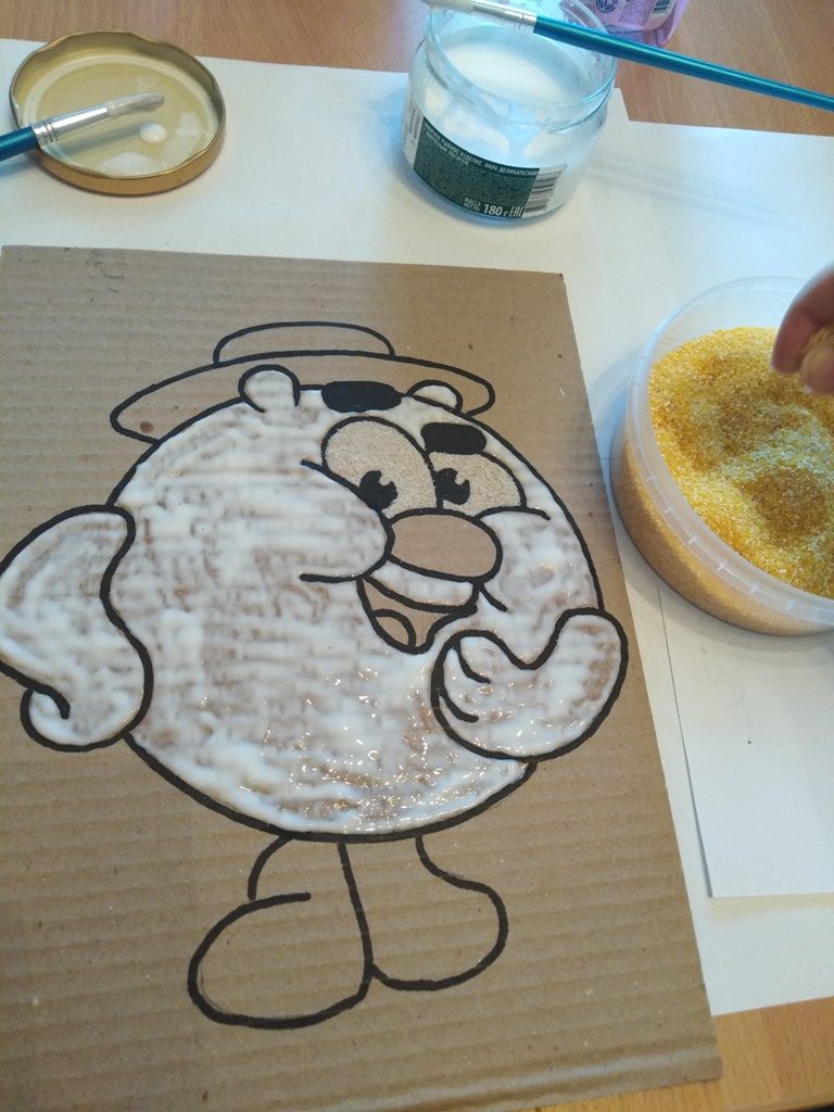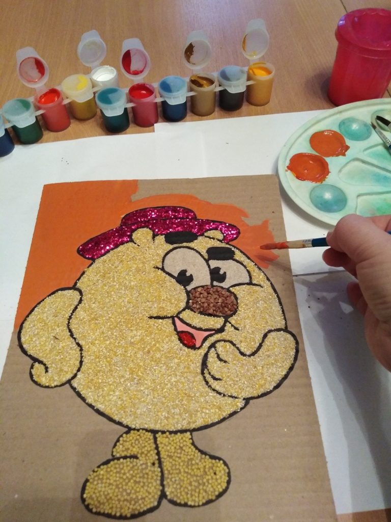 Для выполнения мозаики нам потребуется (картон, шаблон, копировальная бумага, скрепки, карандаш, чёрный маркер, клей ПВА, разнос, гуашь, кисточки, крупы, гр. чай, бисер, блёстки.) Также мозаику можно выполнить из одних круп, контрастных цветов. Параллельно можно сделать сразу несколько героев.