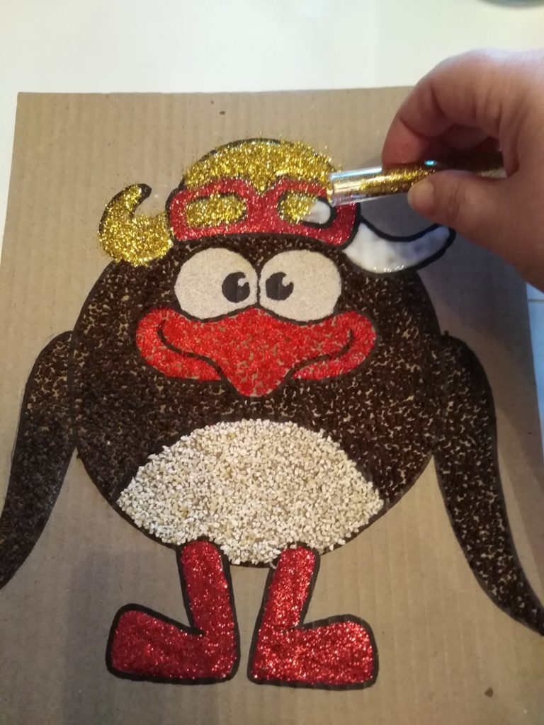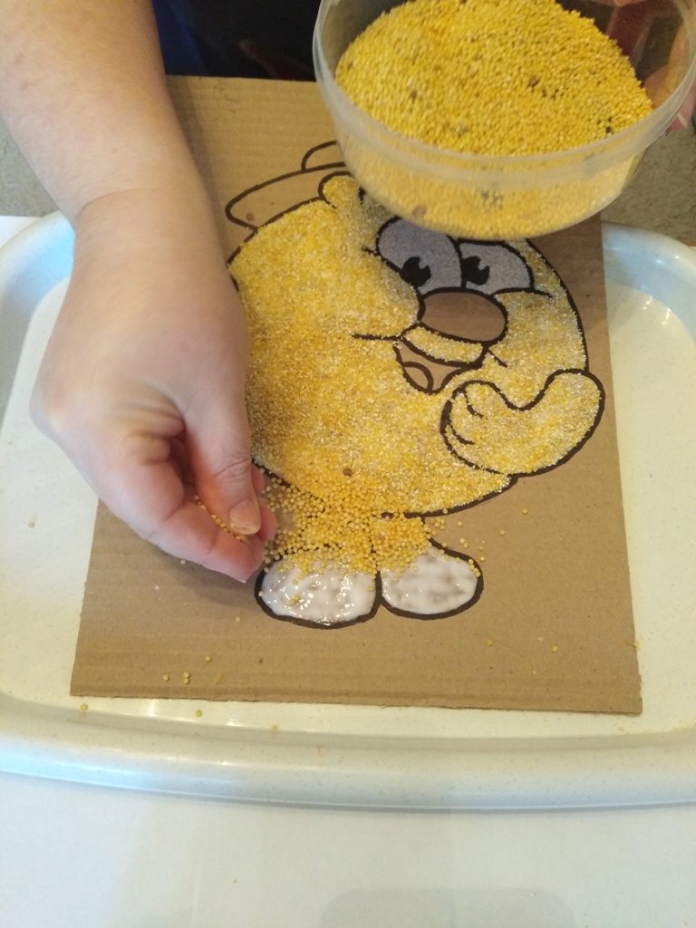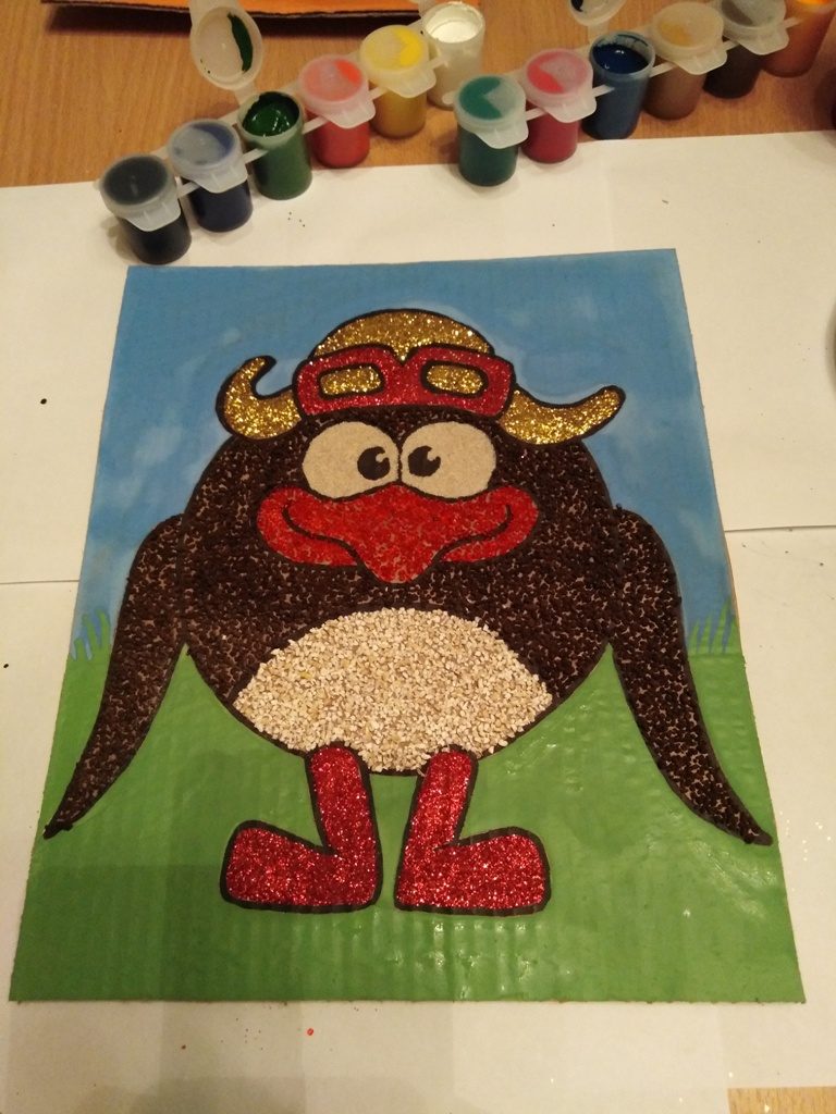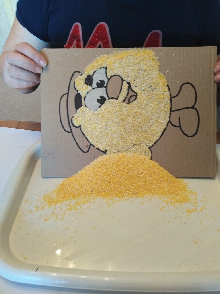 Для выполнения мозаики нам потребуется (картон, шаблон, копировальная бумага, скрепки, карандаш, чёрный маркер, клей ПВА, разнос, гуашь, кисточки, крупы, гр. чай, бисер, блёстки.) Также мозаику можно выполнить из одних круп, контрастных цветов. Параллельно можно сделать сразу несколько героев.