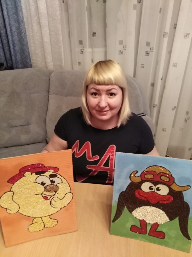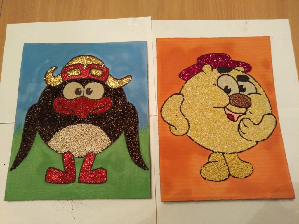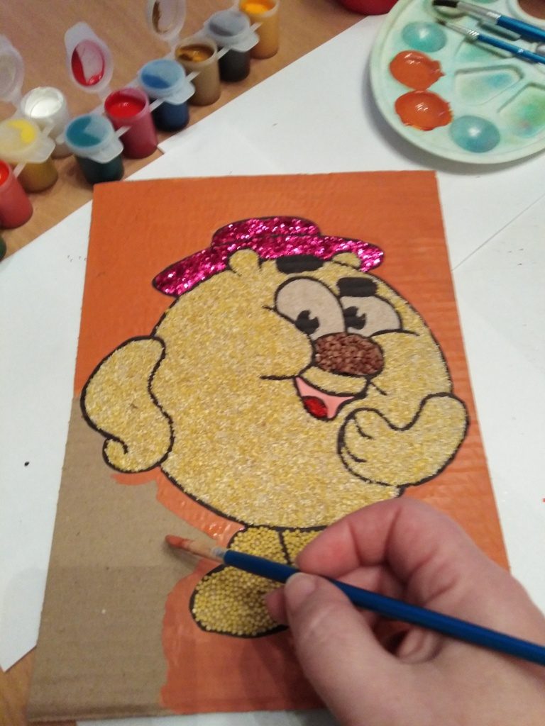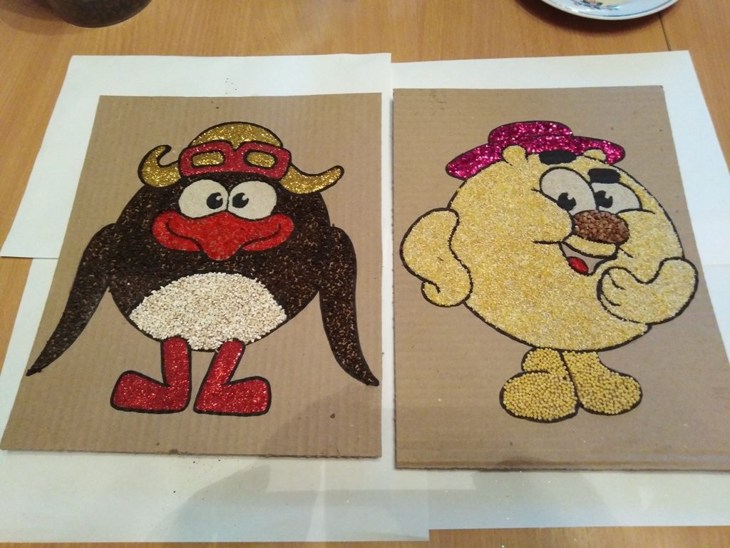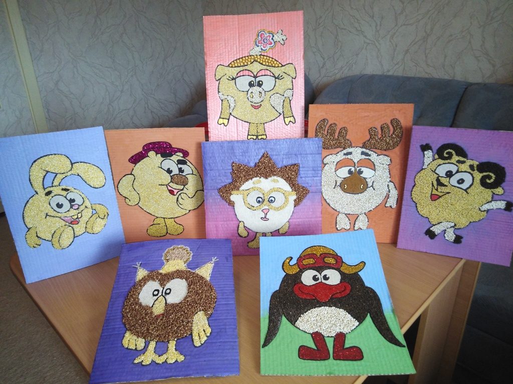 Ваши детки любят и смотрят Смешариков? Предлагаем им сделать своих любимых мульт-героев в технике мозаика (из крупы, гранулированного чая, бисера, блёсток.) см. ниже