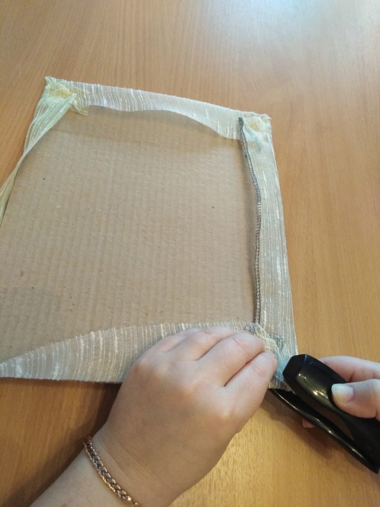 2. Оборачиваем картон органзой закрепляя края степлером.