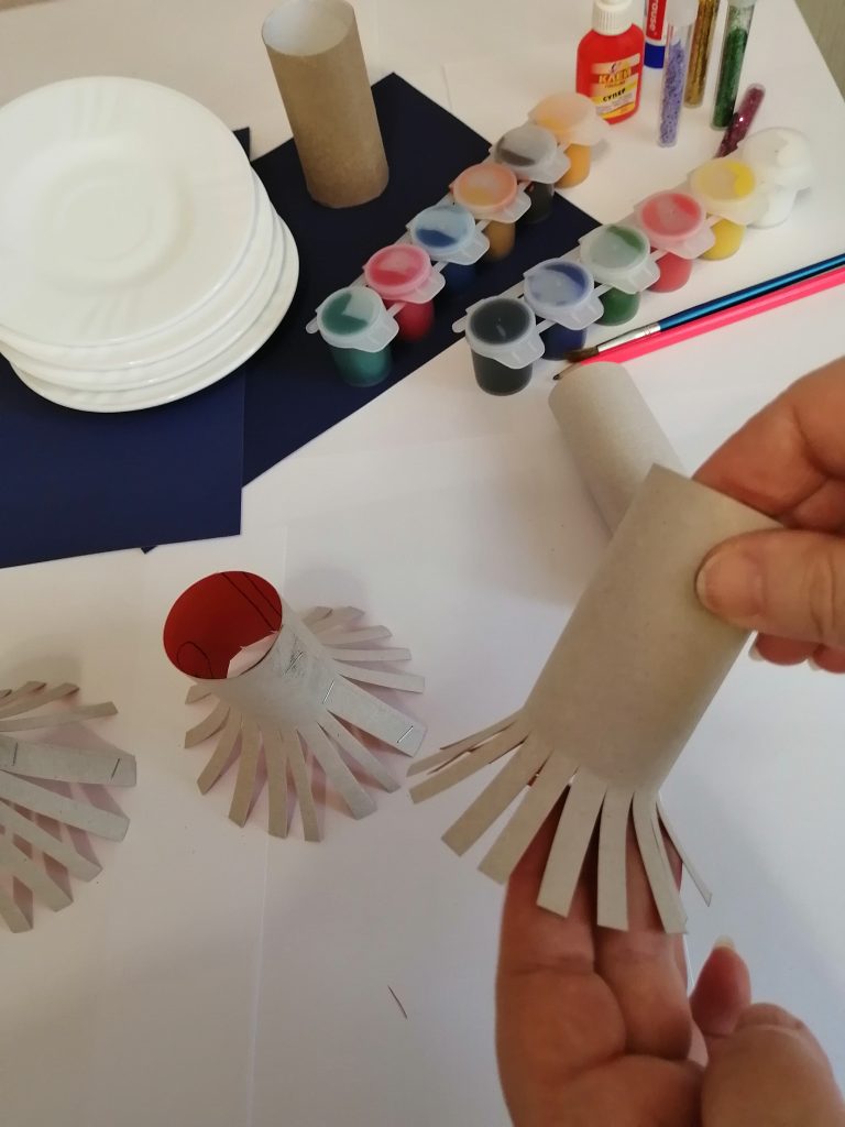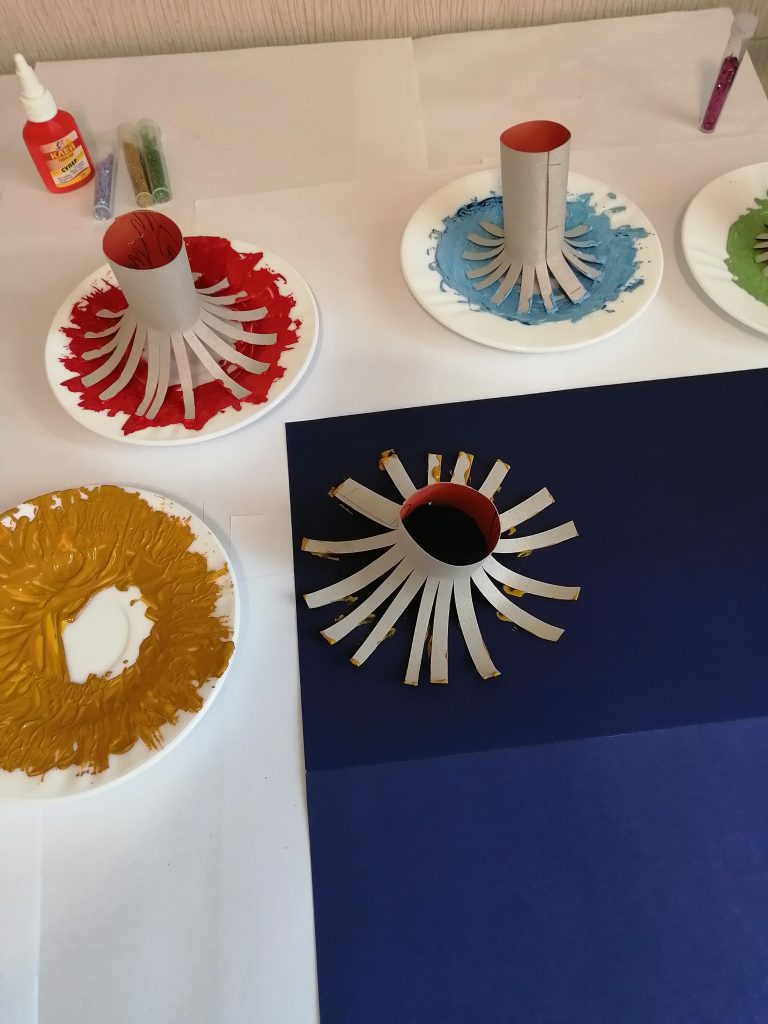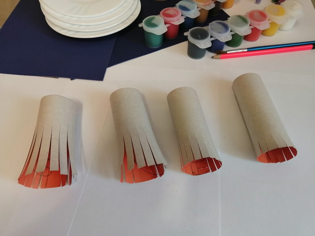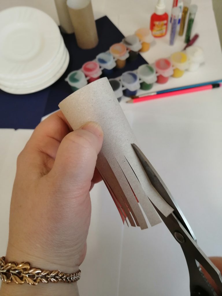 2. Из картонных рулончиков делаем штампы. Один разрезаем до половины, другие на треть, на четверть- все заготовки должны быть разными.