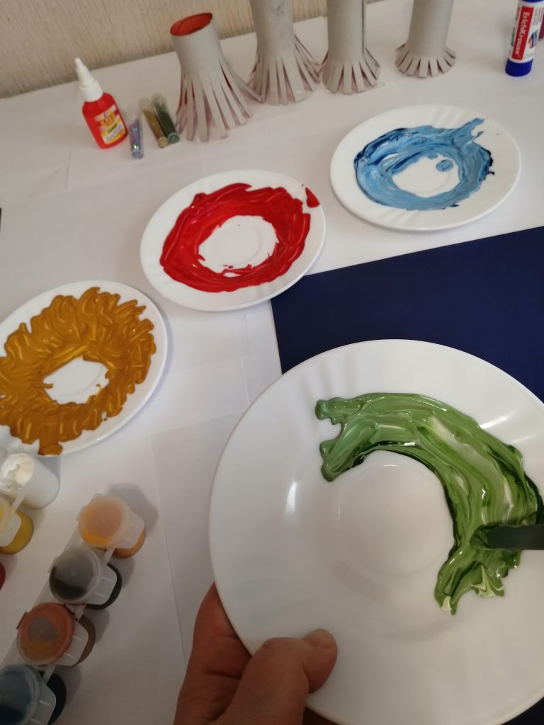 1. Итак, нам понадобиться: Рулончики из картона, Гуашь, Небольшие, плоские тарелочки-палитры, Блёстки из фольги., Клей ПВА, Картон (синего или чёрного цвета)