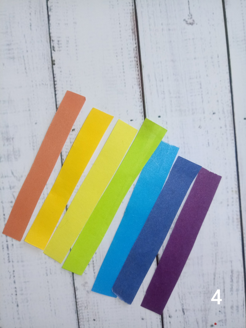 Из цветной бумаги, режем 7 полосок цвета радуги( красный, оранжевый, желтый, зеленый, голубой, синий, фиолетовый), примерно по 1 см и по длине закладочки.