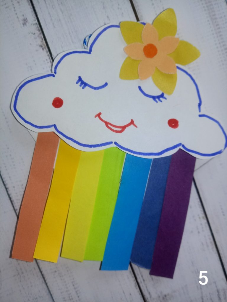 Теперь в таком же порядке приклееваем полоски под облачко и рисуем милую мордашку.