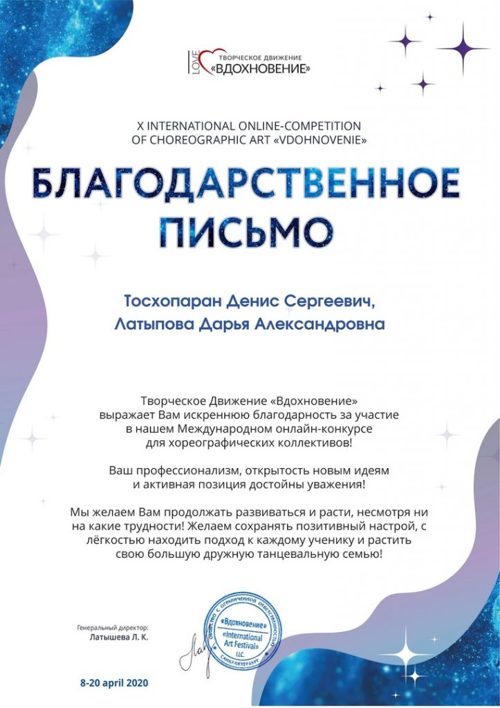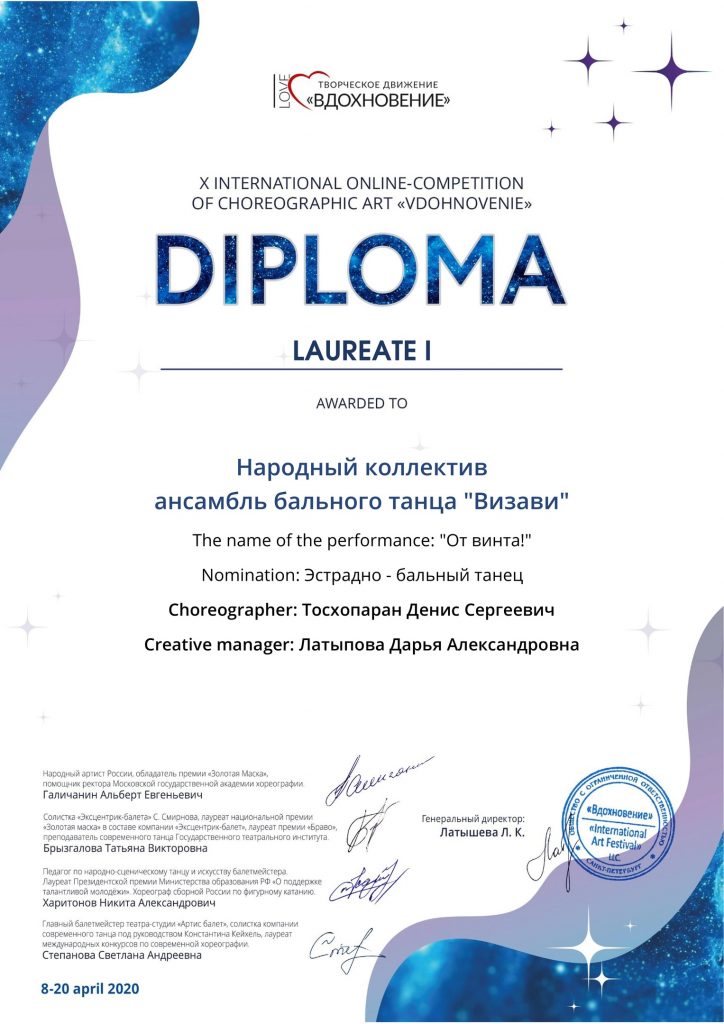 Народный коллектив ансамбль бального танца «Визави» принял участие в X Международном заочном отборочном туре — онлайн-конкурсе «Вдохновение» и стал ЛАУРЕАТОМ 1 СТЕПЕНИ Галичанин Альберт Евгеньевич (представитель жюри) отобрал коллектив «Визави» на следующий этап конкурса, который будет проходить осенью 2020 года!