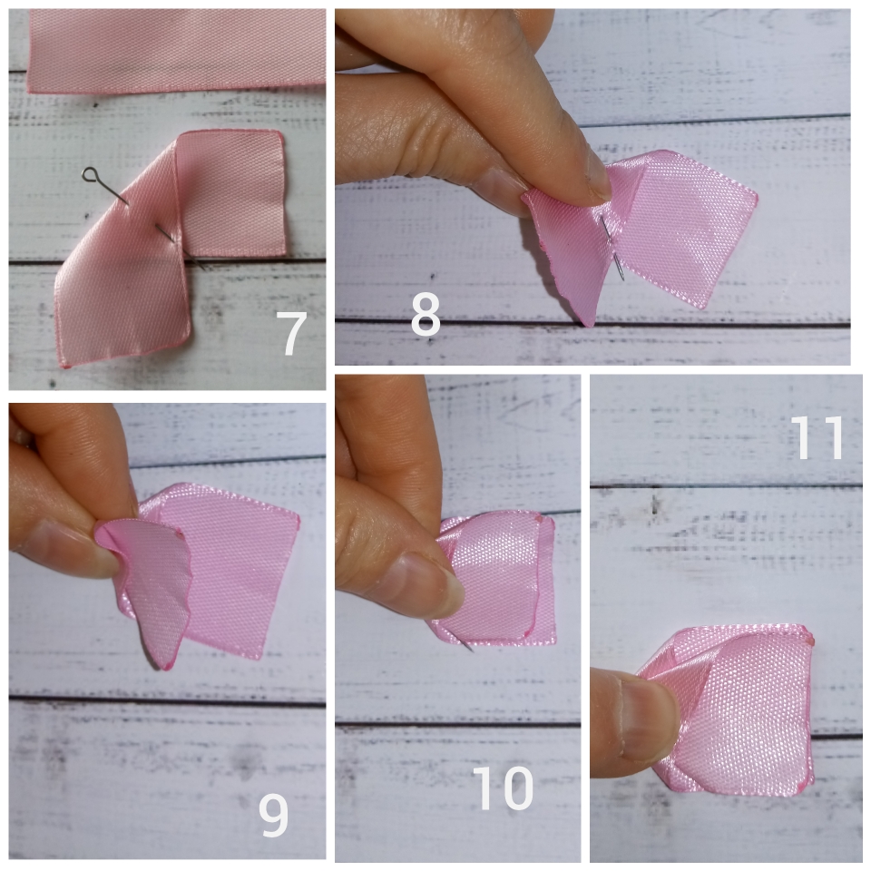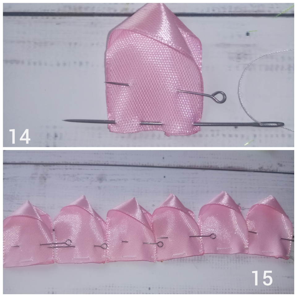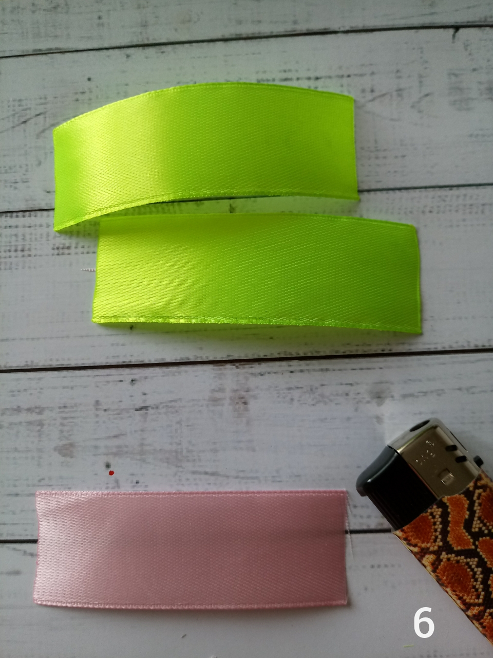 Берем розовую атласную ленту, нарезаем: 6 отрезков по 6,5 см. (фото 3) и 6 отрезков по 7 см. /фото 4/