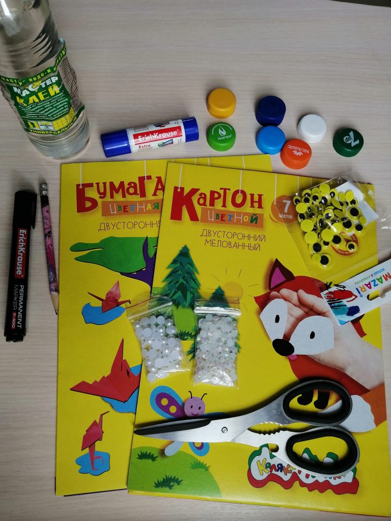 1. Нам понадобиться: цветной картон, крышки, клей, циркуль, полубусины, маркер, карандаш, ножницы, декоративные глазки.