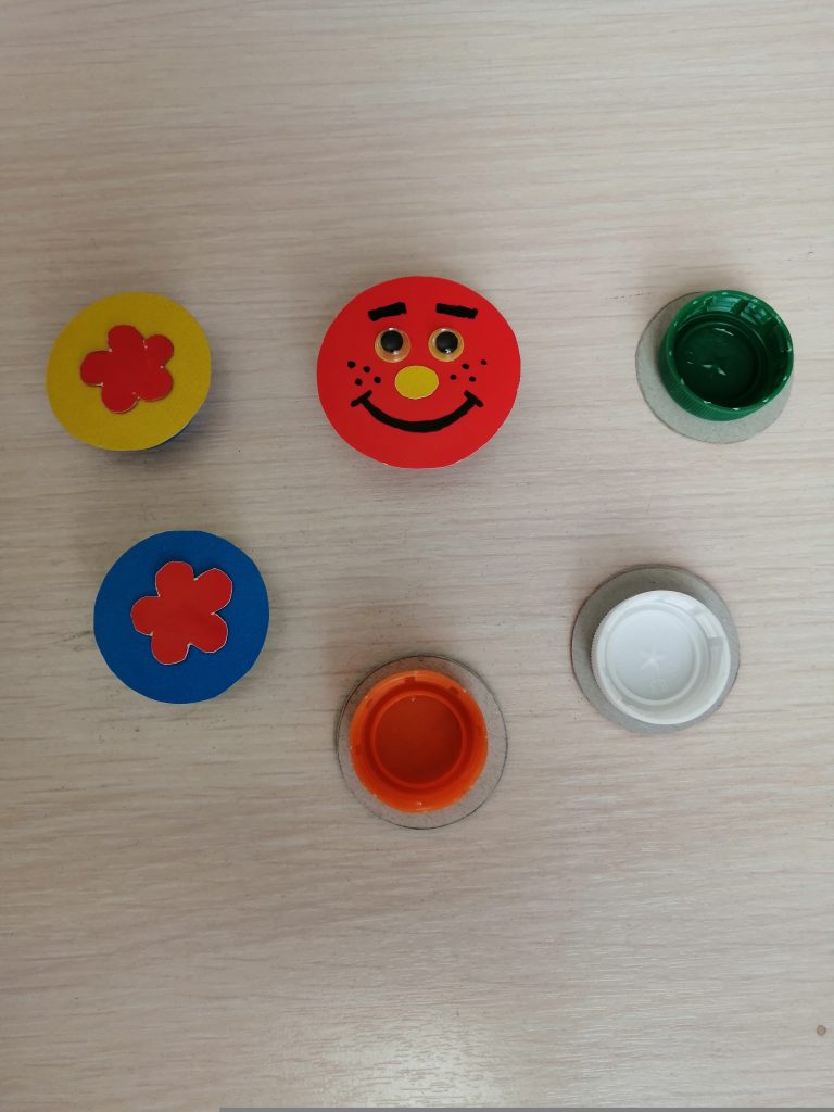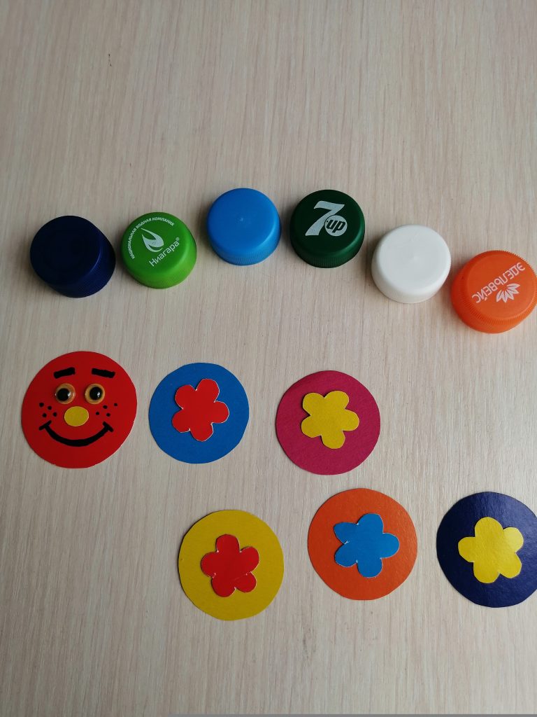 3. Вырезаем из картона круги разных цветов чуть больше диаметра крышек.