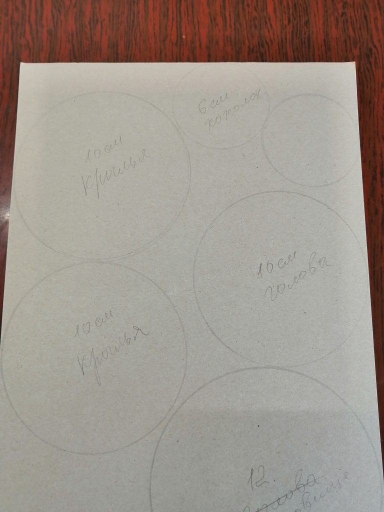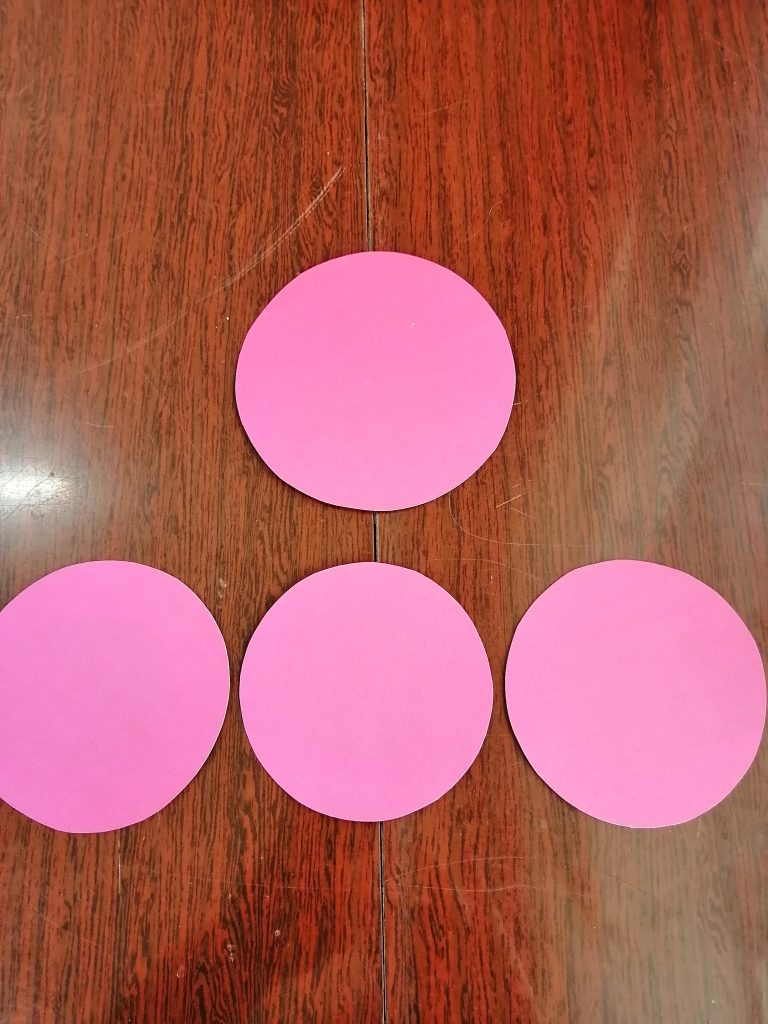 2 Вырезаем из розового картона круги: диаметр 12 см (1 шт.) — туловище, диаметр 10 см (3шт.) — голова и крылья.