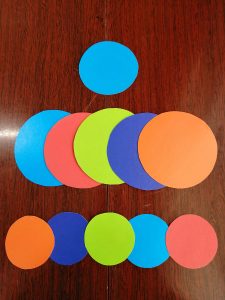 3 Вырезаем из голубого картона круг диаметр 8 см — голова и из разного цвета картона вырезаем 5 кругов диаметр 10 см — хвост и 6 кругов диаметр 6 см — хохолок.