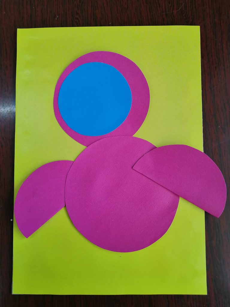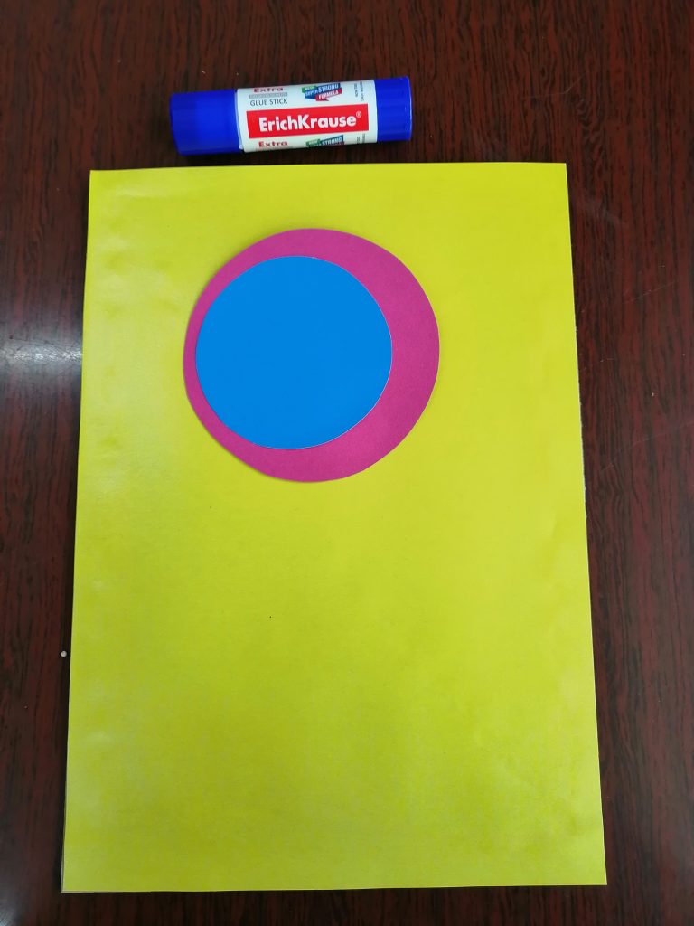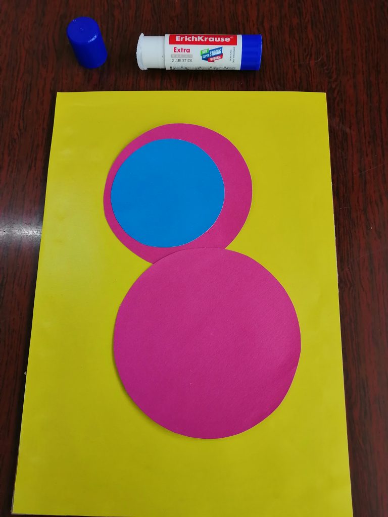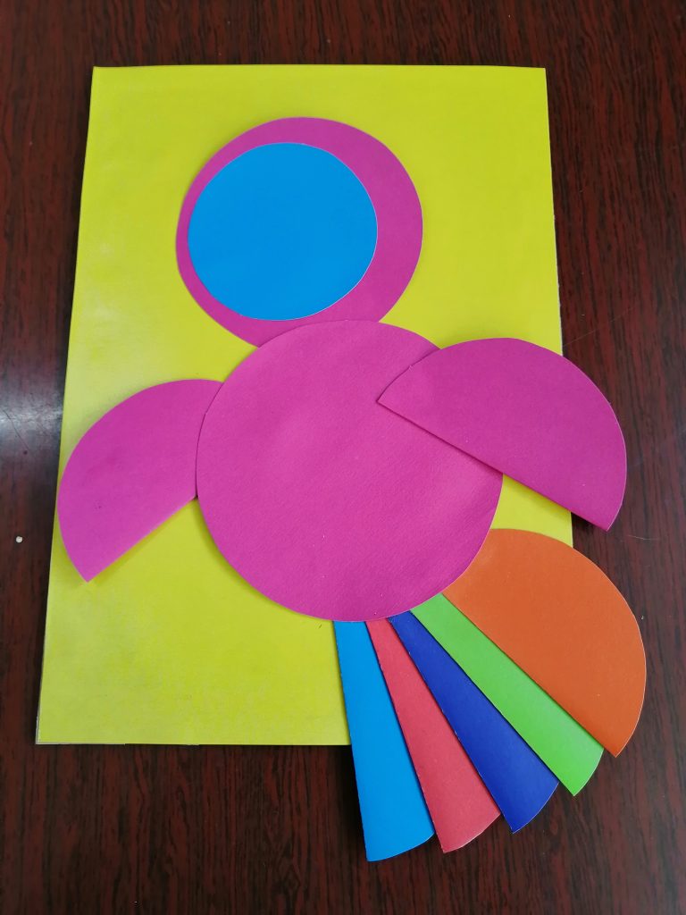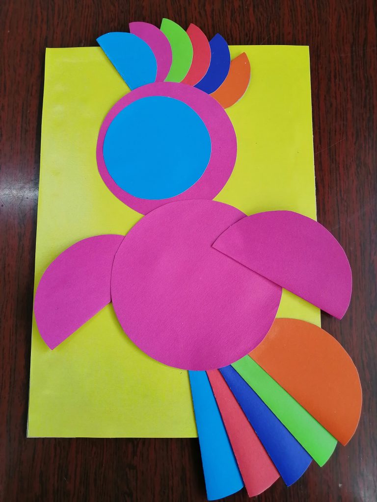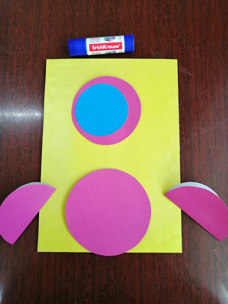 5 Ниже приклеиваем круг туловище ( оставляем место для хвоста) и два круга свёрнутые пополам — крылья. (как на фото)