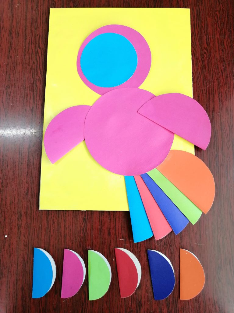 7. Шесть разноцветных кругов сгибаем пополам и приклеиваем- хохолок.