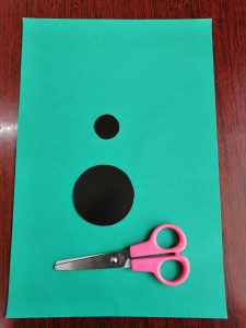 8 Из чёрного картона вырезаем маленький кружок — глаз и круг диаметром 6 см — клюв.
