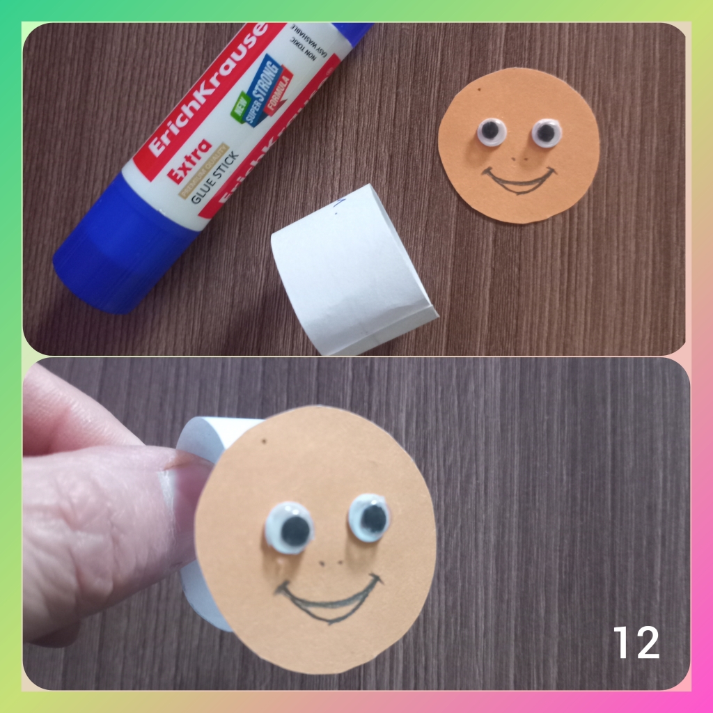 На круге рисуем улыбку и приклеиваем глаза, полоску склеиваем в кольцо и на неё клеим круг. /фото 12/